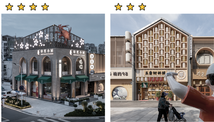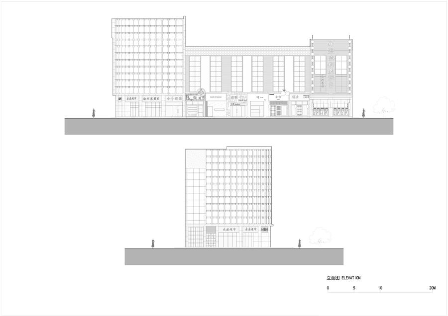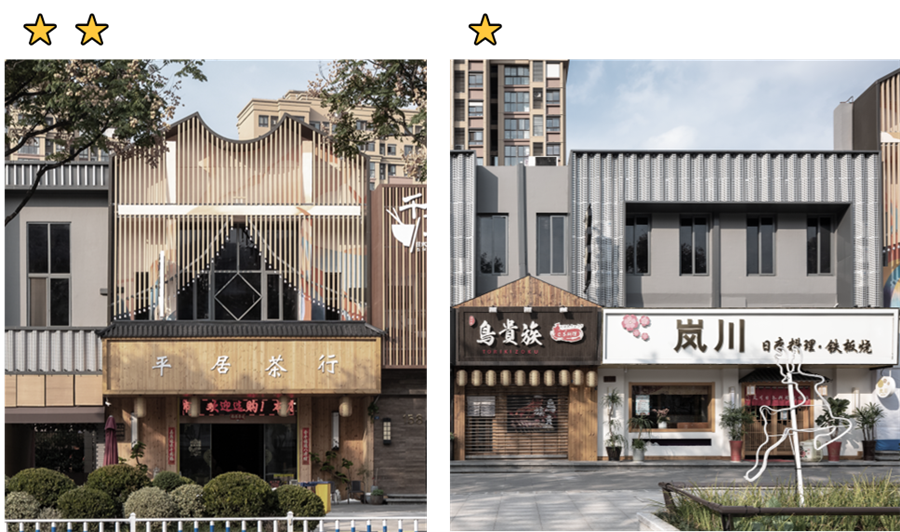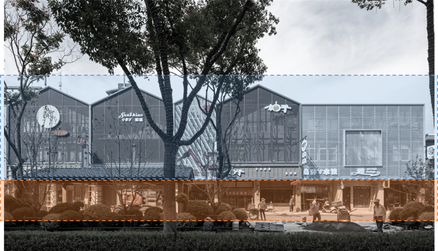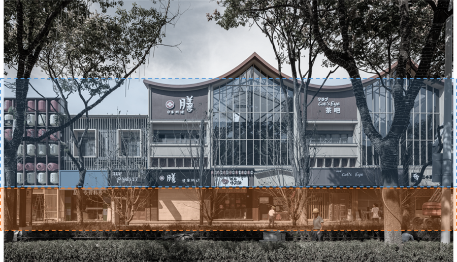 分級打造,求同存異: 由于改造項目的特殊性,面臨商戶多重訴求,首層設(shè)計充分考慮后續(xù)業(yè)態(tài)的靈活性,給予差異化設(shè)計的靈活度,而將整體面貌打造的重點放在二層及以上,塑造街區(qū)形象;同時根據(jù)所在位置的重要性,對立面重要程度進行分級,重點區(qū)域重點設(shè)計。
