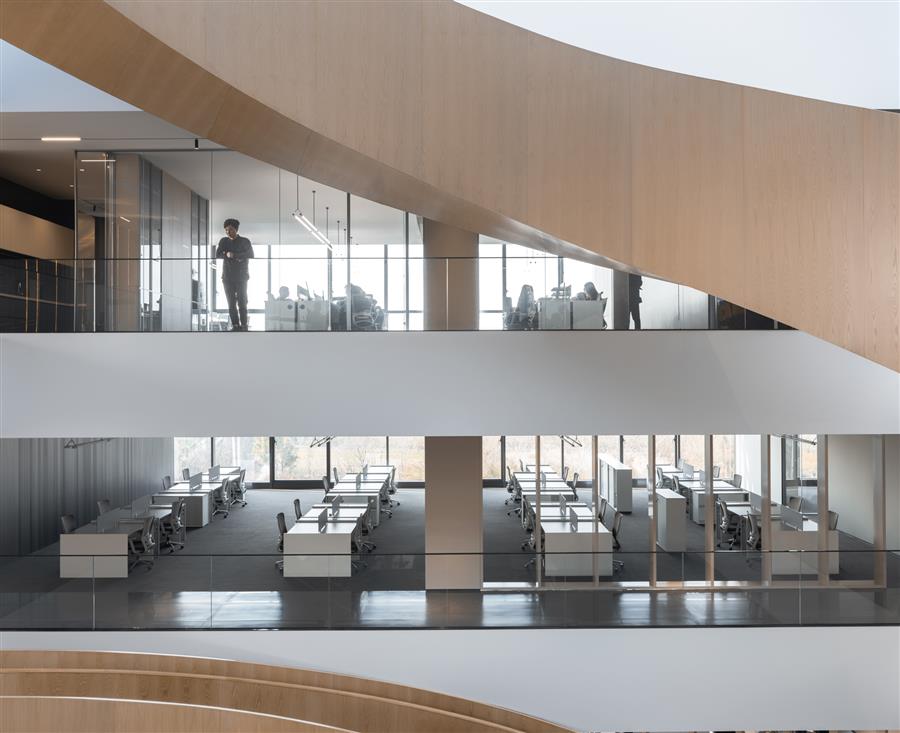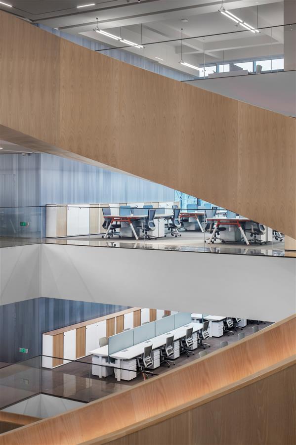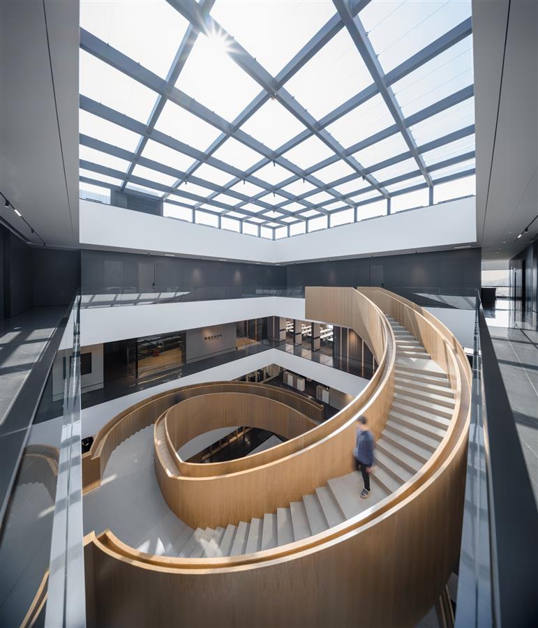 回望中庭,樓梯宛若一座沐浴在陽光下的“游廊”,可開啟天窗為所有樓層的員工提供充足的陽光和新鮮空氣,在工作間隙讓頭腦徹底放松,中庭也成為企業(yè)獨一無二的標志性的身份特征。