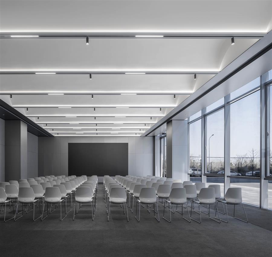 辦公區(qū)域圍繞一座6層通高的中庭布置,中庭中央,設(shè)計團隊設(shè)計了一座高達六層的超尺度的旋轉(zhuǎn)樓梯,仿佛一座巨大的舞臺,依次經(jīng)過接待,會議,銷售,設(shè)計,研發(fā),培訓(xùn),展廳,總裁辦公區(qū),仿佛一座延展的剖面,將整座總部如何運轉(zhuǎn)清晰的呈現(xiàn)出來。