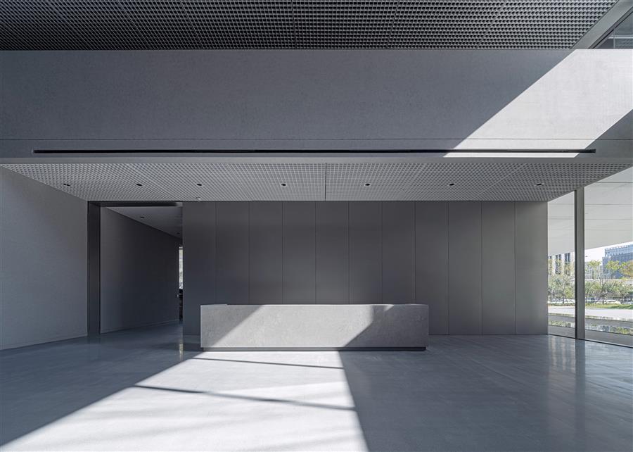 當(dāng)你由主入口步入門廳,左右兩側(cè)中庭界面在深淺的對(duì)比中靜謐流淌,在一明一暗間,接待、前臺(tái)、展示依次徐徐展開。
