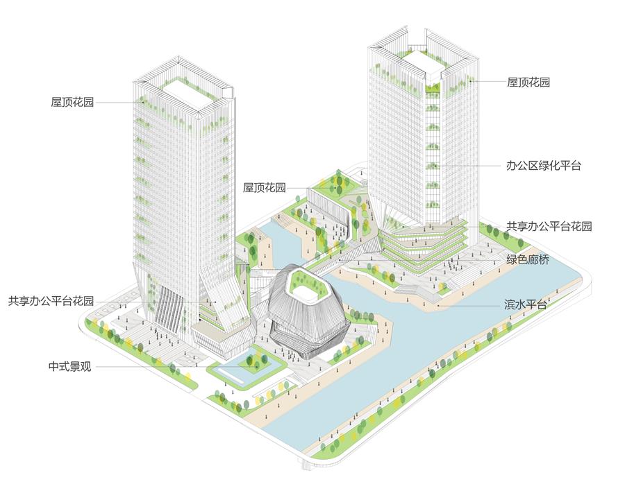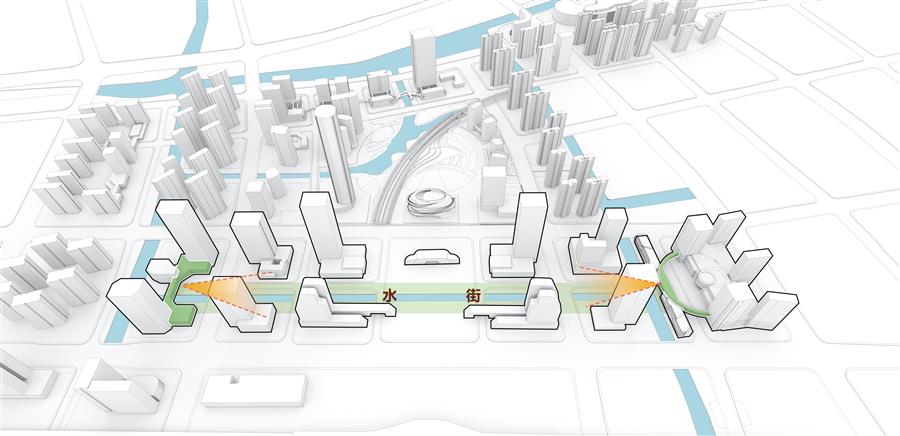 同時水街沿線兩側的其他地塊均已建成,為傳統(tǒng)高層商務辦公帶裙房配套的形式。裙房空間利用率低、商業(yè)功能體驗感較差,空置率較高、建筑景觀融合性不佳。這些現狀對新地塊設計也提出了功能設定的創(chuàng)新要求。