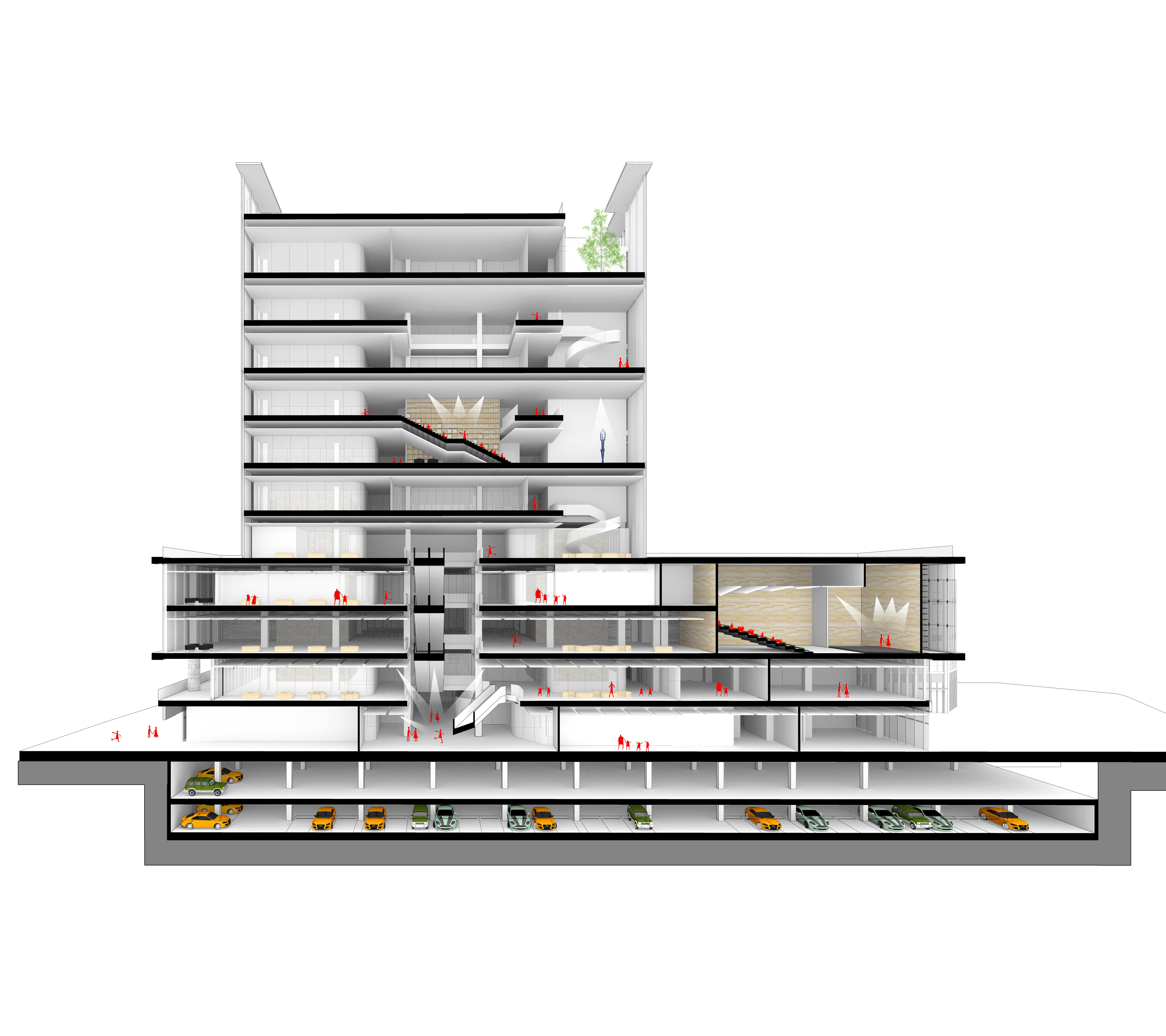 中庭是連接豎向空間的“街道”,每層是一個(gè)“街區(qū)”,人們可以從一層通過公共空間到達(dá)建筑的任一樓層。在這里有戲劇、音樂會(huì)、歌舞劇、講座、培訓(xùn)在上演和落幕,在建筑中游走,仿佛在閱讀一座城。