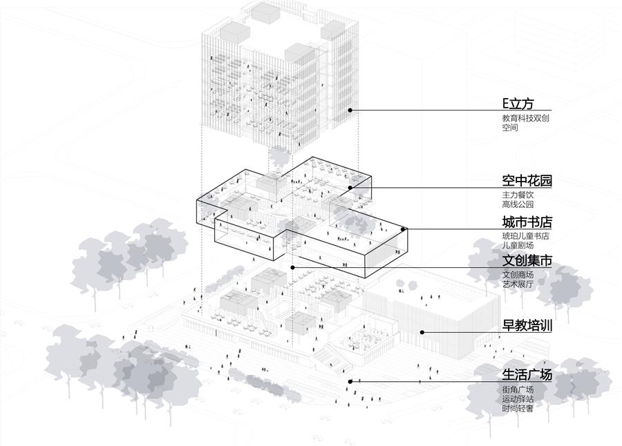 建筑地上建筑面積3.68萬(wàn)平方米,塔樓是一個(gè)以培訓(xùn)和傳承為主題的立方體,約占總面積的40%,其余55%面積在群房作為文創(chuàng)商業(yè)配套,包含一個(gè)小型的托育園,一個(gè)400座的小劇場(chǎng),一個(gè)多功能展廳,一座主題書店,以及配套餐飲和親子主力店。
