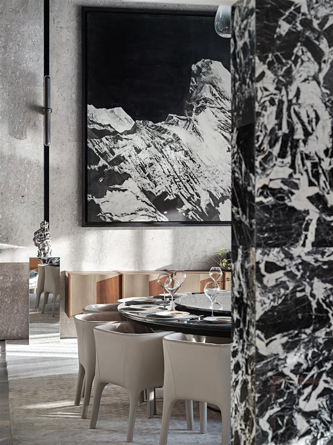 遠山與白雪,峰層與格局,在畫幅尺度間被無限解構(gòu)。大理石的脈絡,循著畫意,映著畫中的山巔,兩相觀照之下,宴會廳的氣質(zhì)愈顯曠達。