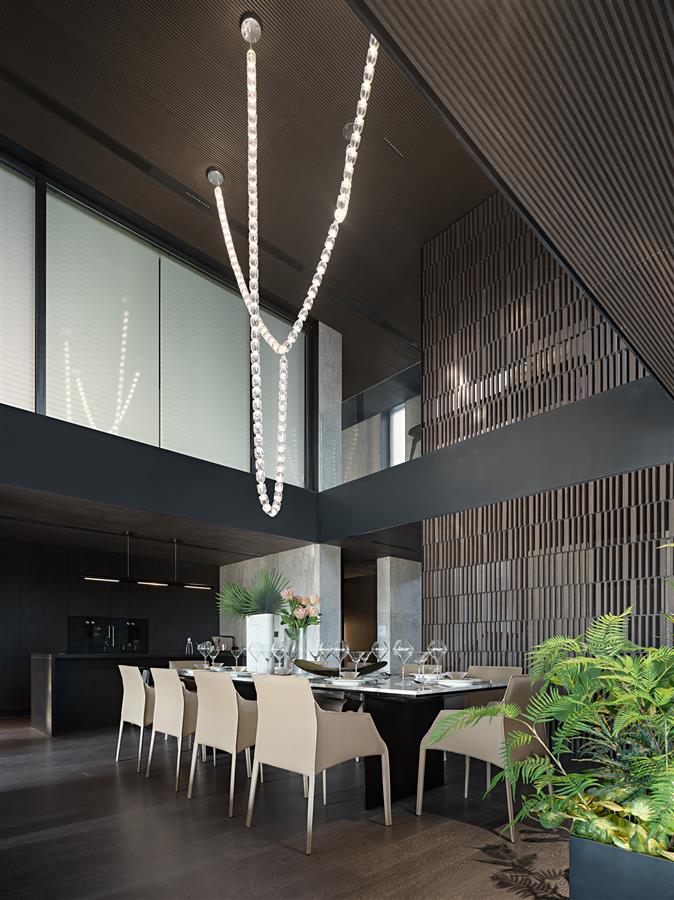 “水之墅”共5層,其中1樓挑高約6米,帶夾層,如此開闊的大宅尺度,如此立體的縱深結(jié)構(gòu),為設計師后續(xù)的生活構(gòu)景和藝術(shù)布設留下了自由的可能性?!叭绾卧诠δ苤?,構(gòu)建出能觸達居者內(nèi)心期許的生活場景,是我們的深度追問。最終以設計來回應追問,解答自然、藝術(shù)與生活的共生關(guān)系,在精神的契合中達至格局的共鳴?!?/p>