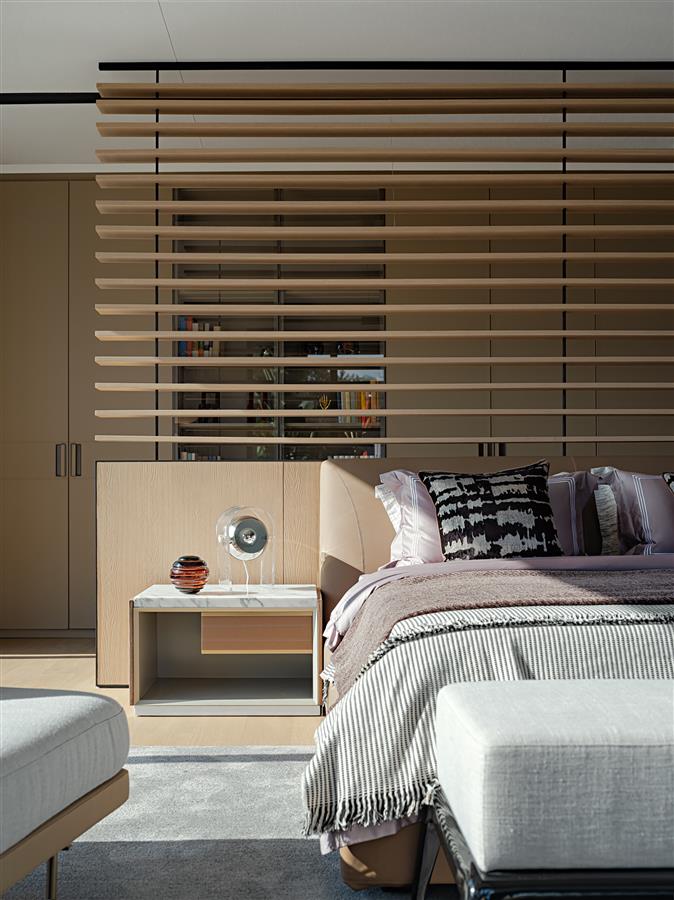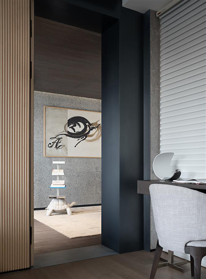 “藝術(shù)從生活中來,是一種觸手可及的美學溫度,同時藝術(shù)是有鋒芒的,我們希望借由藝術(shù)構(gòu)建生活與詩意之間的橋梁,橋接居者的氣場和日常的儀式感?!彼囆g(shù)顧問Simon如是道。木藝為簾,在主臥空間的休憩與休閑之間劃下了分隔符,隔而不斷的是空間的溫情,以及若隱若現(xiàn)的藝術(shù)意境。