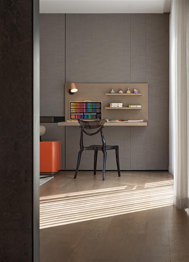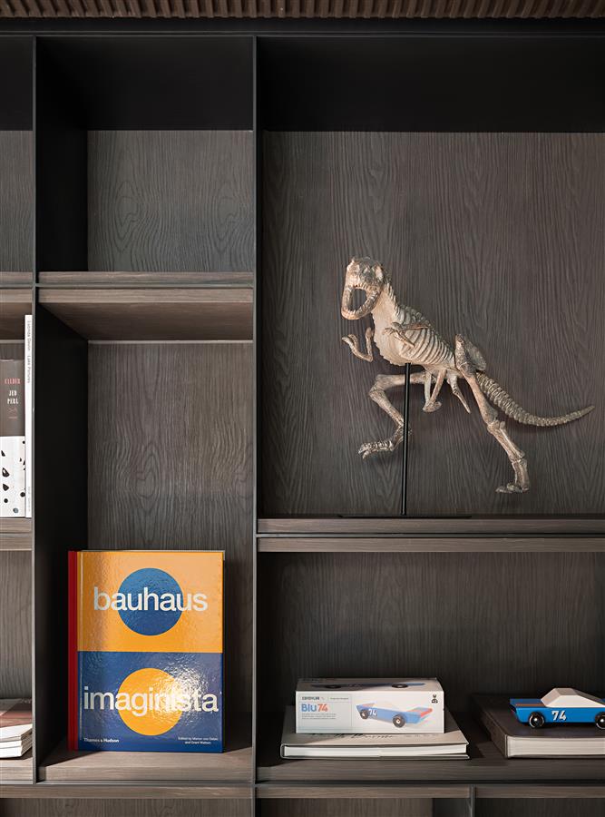 設計師賦予孩童的空間以生活方式的動態(tài)變化感,以藝術(shù)化的解構(gòu)手法讓空間極具包容性。沉穩(wěn)的墨青調(diào)與窗外蒼翠相映,詮釋獨屬于男孩房的充沛活力,豐富的物件伴隨著居者的成長步伐,存續(xù)無限記憶。
