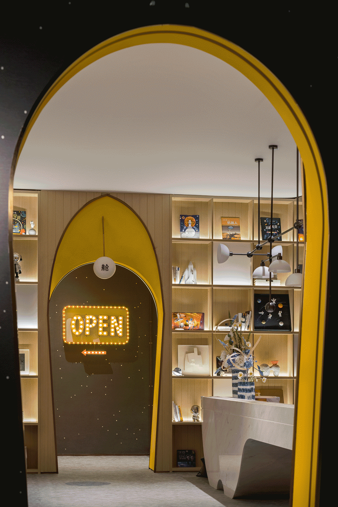 一幅繪于墻面的插畫,生動(dòng)地呈演著航天員翱翔太空的奇妙故事。作為空間的序曲,設(shè)計(jì)師穿越時(shí)空的桎梏,透過畫面語(yǔ)言的傳達(dá),隱喻這場(chǎng)星際迷航的開始。而作為置身于其間的觀者,也從現(xiàn)實(shí)走入宇宙的秘境中,展開一段夢(mèng)幻的星空遨游。