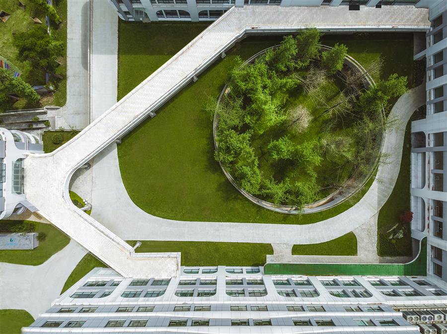 候診空間和中庭花園的融合,醫(yī)院內(nèi)庭花園和地下室下沉庭院的融合,屋頂花園與裙房的融合…… 30余畝的內(nèi)庭花園和沿江綠地花園打造,使整個建筑空間更加豐富有層次,與山石、水景等自然元素相搭配,通過對景、借景等園林造景手法,構(gòu)建無限貼近自然環(huán)境的景觀空間,與都江堰、青城山豐富的森林植被相呼應(yīng),增強自然氣息,突破傳統(tǒng)醫(yī)療空間設(shè)計,激發(fā)使用者的正向情感,消除身心障礙,將溫暖與療愈進行到底。
