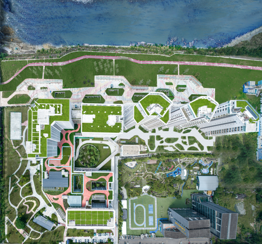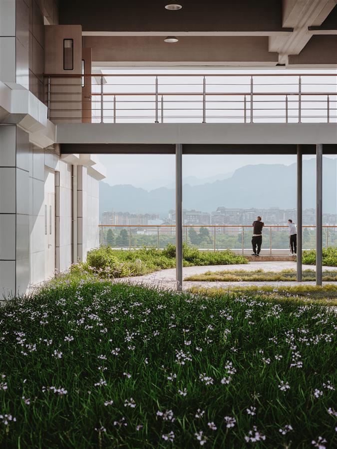 整個場地抬高5米與岷江堤肩齊平,與整個岷江綠道統(tǒng)一打造,豐富了整個城市的活動空間。根據(jù)院區(qū)地形,西北側(cè)為城市的主干道。院區(qū)道路采用城市型雙坡道路,瀝青混凝土路面,高層建筑區(qū)域均設(shè)有環(huán)形消防車道。院區(qū)場地雨水的排除采用有組織排水,利用雨水管排向市政雨水管道。