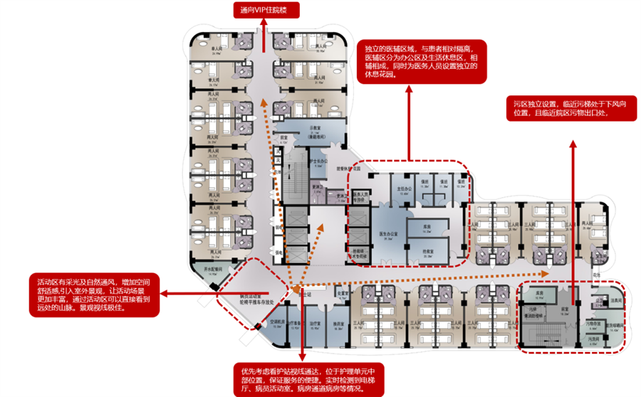 高效順暢的動線流程能夠極大地提升醫(yī)院的運營效率,緩解就醫(yī)壓力和矛盾?;颊咧辽?、急救優(yōu)先,有明確的流線指示,有清晰、獨立的導(dǎo)引流程,能夠最大限度地縮短患者車輛與就診區(qū)域的空間距離,可以提升運營效率的最大化。本項目中“醫(yī)療街”把門診部、醫(yī)技部、住院樓緊密聯(lián)系在一起,縮短病人的就診流線,提高了整個醫(yī)院的運營效率。急診科與放射科相鄰,體檢中心和放射科臨近設(shè)置,設(shè)備共享;手術(shù)室和ICU同層布置,內(nèi)部通道直接相通,減少二次污染和換床;手術(shù)室和中心供應(yīng)室上下垂直布局,通過污梯和潔梯相連,達到手供一體。
