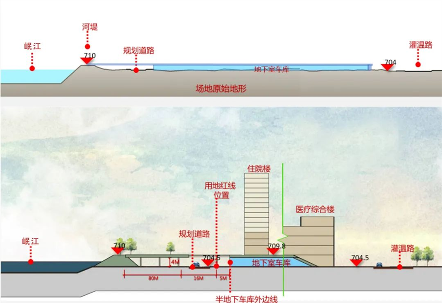 項目整個地塊呈“L”形,總圖布局為半圍合式,由綜合醫(yī)療大樓、康養(yǎng)大樓及綜合配套設(shè)施構(gòu)成。綜合醫(yī)療大樓由兩棟一類高層醫(yī)療建筑構(gòu)成,1-4層為門診部、醫(yī)技部,5至16層為住院部,兩棟高層采用空中綠化平臺連接。旁側(cè)三棟為一類高層康養(yǎng)建筑,規(guī)劃用途為康養(yǎng)中心及專家樓。病房和康養(yǎng)居室均沿岷江布置,倚窗遠可賞連綿青城山景,近可觀岷江之水旖旎向前,景觀視線極佳,利于醫(yī)養(yǎng)。