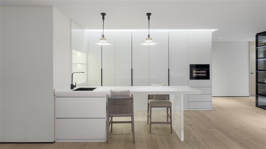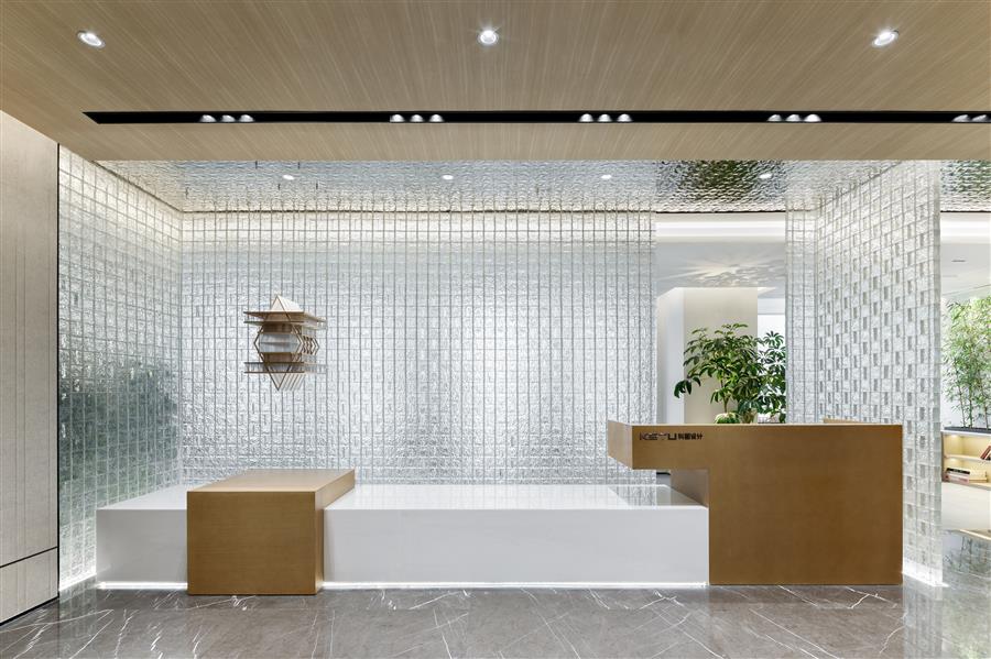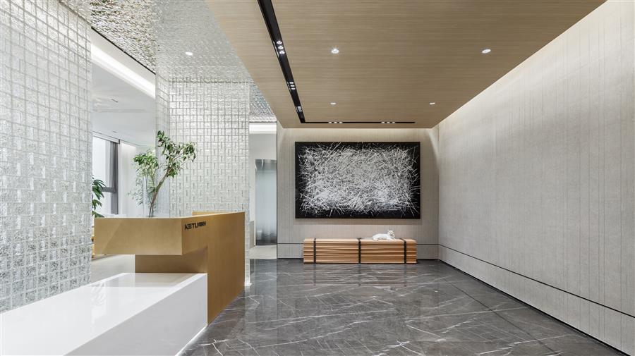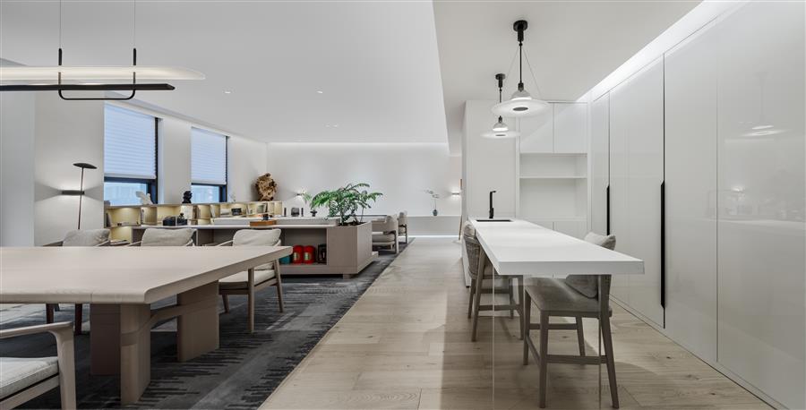 踏入電梯廳的那一刻,溫潤的木質(zhì)盒子形成包裹,迎面粗糙的白色石材背景靈感來源自中式園林的照壁,暖色線性燈光引導形成歸家之儀式感。電動門緩緩打開,簡潔克制的幾何空間映入眼簾,設(shè)計師以分割精確的比例線條,貫穿視覺元素,不同材料的碰撞形成戲劇般的效果。堅硬的、柔軟的、透明的、溫潤的,在光的跳躍中慢慢融合。整面透明的水晶磚在光線的穿透下波光粼粼,猶如晴天蕩漾的湖面,時光靜好。