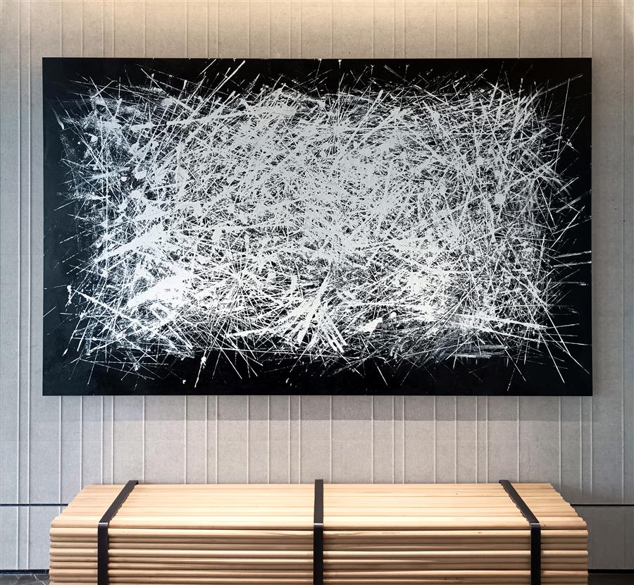 前廳懸掛的藝術(shù)創(chuàng)作,由多位科圖建筑師親手繪制而成。以純粹沉穩(wěn)的黑色為畫面基底,中性、中立的白色線條自成態(tài)度的發(fā)散、重組與聚合,線條與線條之間建立起緊密的幾何聯(lián)系,讓畫面看似自由零散,實則有序,給人留下充滿探索感和神秘感的獨特印象。猶如建筑師工作過程中,面臨著千頭萬緒的不確定性與復雜多變的可能性,我們需要不斷探索與發(fā)現(xiàn)找出最適合項目的解析方式。