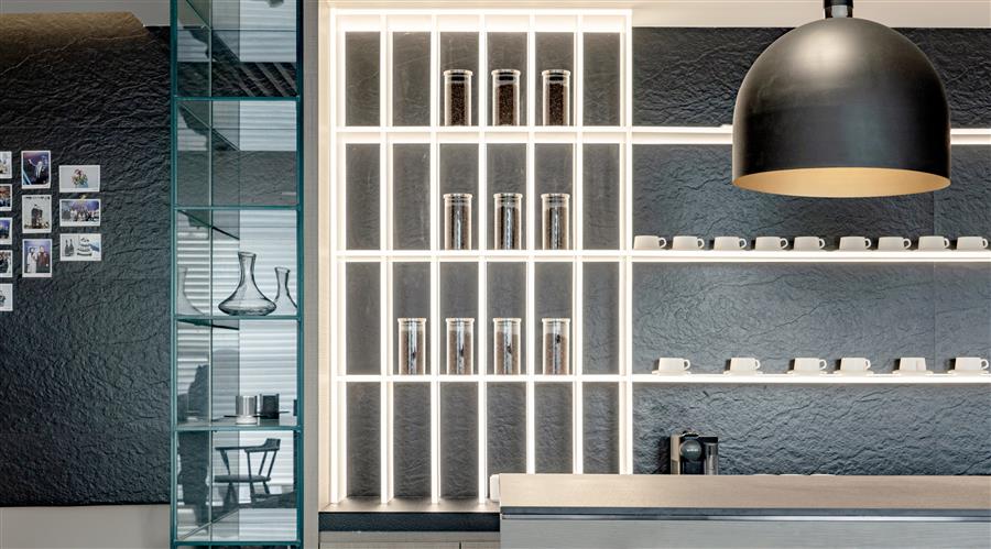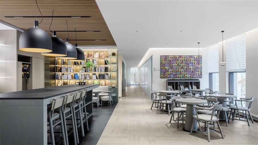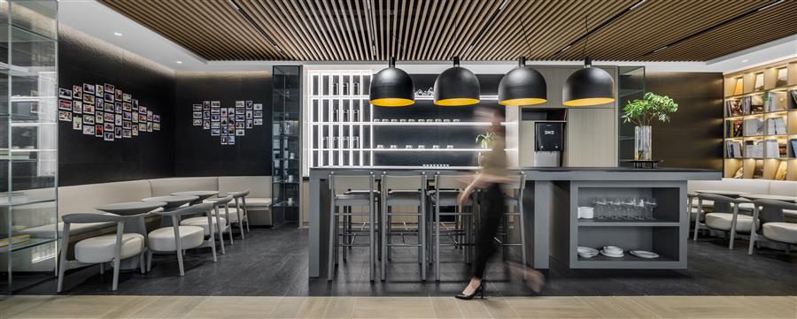 平時這里作為員工的茶水、休息、就餐區(qū)域,同時也兼顧了臨時接待、開放式的洽談討論功能。員工的生日會、節(jié)日活動、主題沙龍都在這里舉行。這里就像人體的心臟功能,鏈接了各個區(qū)域和部門,家庭會客廳般的空間效果,將大家有機的聯(lián)合在一起。