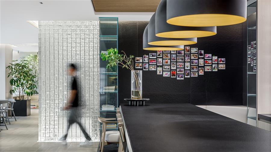 咖啡區(qū)是承擔接待以及公司分享的場所,功能的多樣性賦予其多重身份,幾何的分割結(jié)合不同材質(zhì)形成結(jié)構(gòu)的框架,以體塊成為空間審美品質(zhì)的鋪墊。人們在設(shè)計空間中感受到的設(shè)計,終將歸于時代留痕,價值生長。