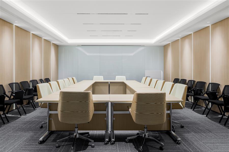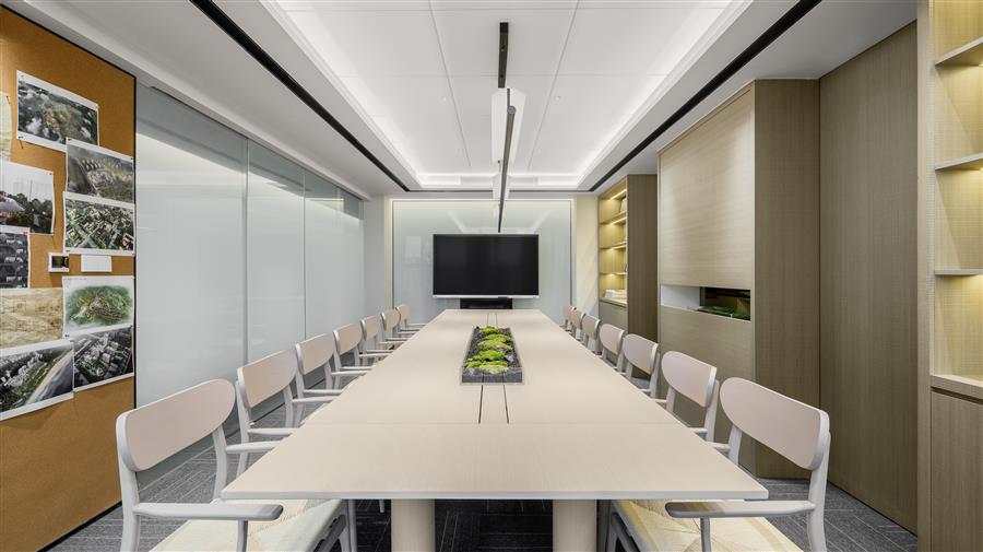 會議室以多個“ 玻璃盒子 ”方式植入到整個空間,動態(tài)透明的玻璃區(qū)隔,使原來空曠而均質(zhì)的空間,因界限與功能的模糊化,衍生出復合錯落的空間秩序。