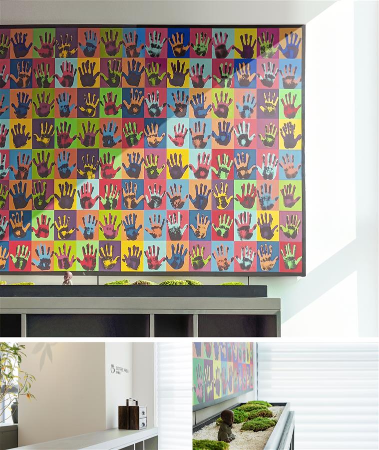 書架上懸掛的章印藝術(shù)創(chuàng)作,也是由科圖小伙伴親手制作而成。五顏六色,大小不一的掌印在有序的柵格中匯聚,凝練而精致,傳達出公司關(guān)注每一位員工的成長,接納不同個性與思維,鼓勵不同的創(chuàng)意與發(fā)聲。與廊道中的照片墻遙相呼應,烘托出公司開放、有趣、鼓勵互動的文化氛圍,打造一個能激發(fā)更大協(xié)作意識和創(chuàng)造力的舒適空間。