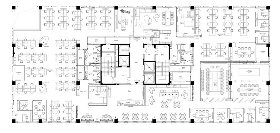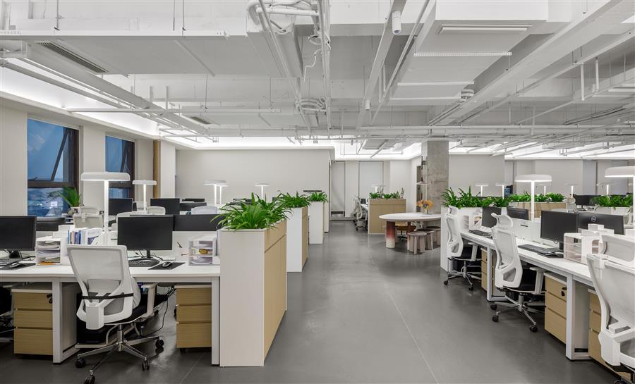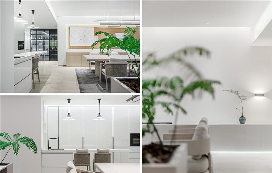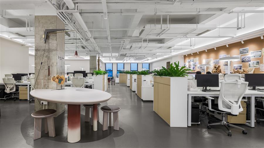 方正的空間限制了想象,但也被設(shè)計師賦予新靈感。設(shè)計以“ 游走 ”的空間形式串聯(lián),承序游園之感,讓光線和植物在空間中滲透。整個公共辦公區(qū)形成一種流動的空間格局,給人以“ 無邊界 ”回歸本質(zhì)的空間體驗。