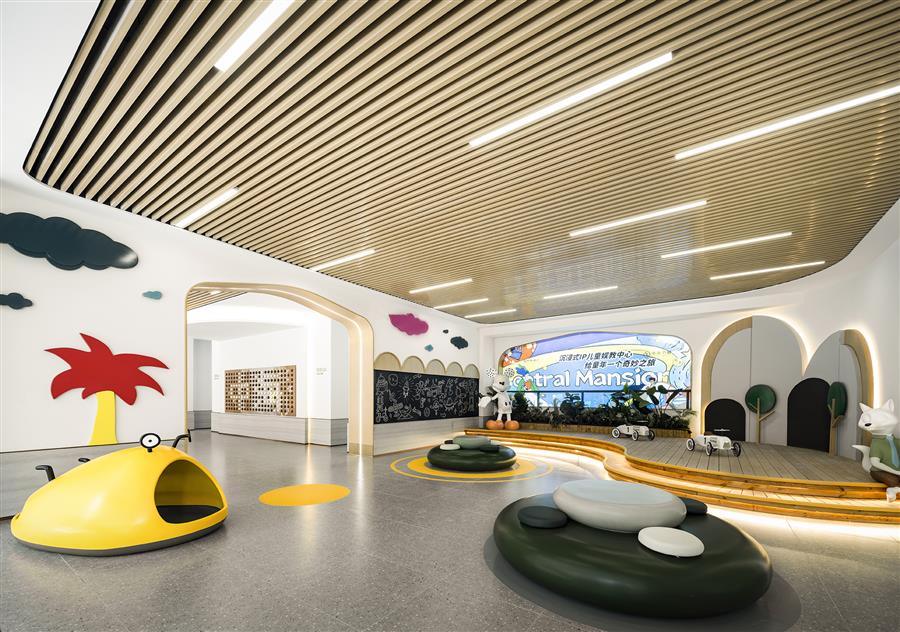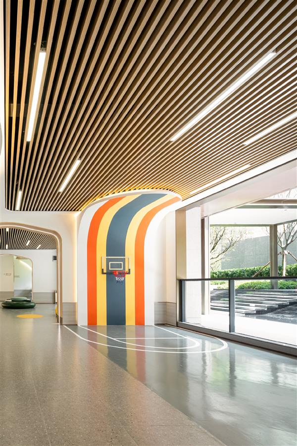 為孩子們打造的室內(nèi)小型籃球場(chǎng),契合使用者的玩樂狀態(tài),設(shè)計(jì)師以碰撞的色彩賦予空間靈動(dòng)的節(jié)奏感,明亮的線條燈隱藏在柵格條紋吊頂中,曲面異形的籃板暗合地面的球場(chǎng)界線,在保障安全之余為孩子的快樂運(yùn)動(dòng)預(yù)設(shè)更多趣味。