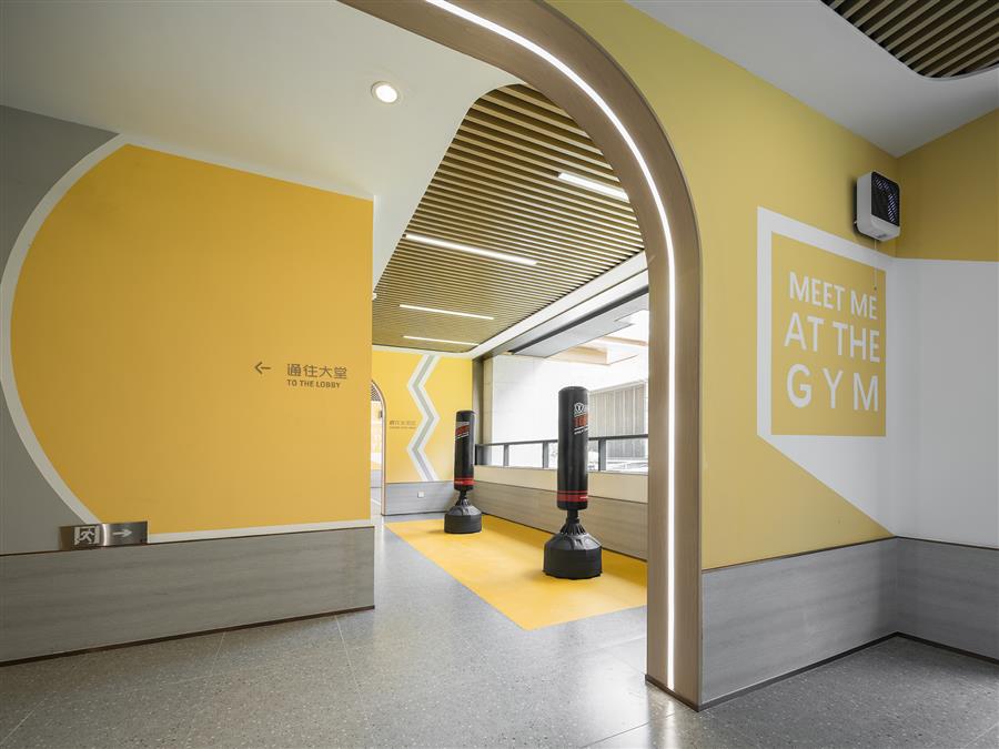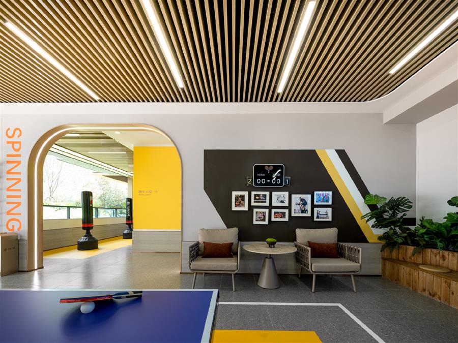 居家之外的運(yùn)動(dòng)生活在豐富多彩的乒乓賽事對(duì)決中展現(xiàn),淮安中?!ぞ砰屑芸諏觽€(gè)性潮流化的空間營造,讓健身區(qū)域成為社區(qū)中互動(dòng)空間最受歡迎的版塊。立面豐富的元素符號(hào)化為視覺引導(dǎo),串聯(lián)專項(xiàng)運(yùn)動(dòng)劃分的空間功能板塊,讓使用者面對(duì)自然的健身新場(chǎng)景,隨時(shí)隨地融入健康生活。