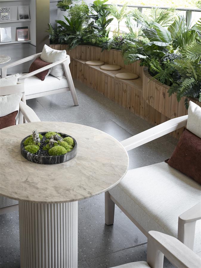 因此,設(shè)計(jì)師選擇通透的落地玻璃、綠籬圍墻、欄桿扶手等半圍合手段,使場(chǎng)內(nèi)場(chǎng)外形成互通空間,并設(shè)置連廊讓空間更具聯(lián)通性,在序列感與延伸感中,柘壹設(shè)計(jì)于此塑造出開放自由、融合自然的“社區(qū)洄游聚場(chǎng)”。