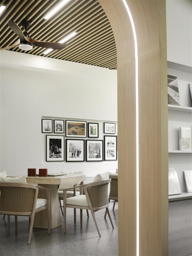 休閑區(qū)一側(cè),空間干凈溫馨的氣質(zhì)在現(xiàn)代的設(shè)計(jì)手法中顯現(xiàn),設(shè)計(jì)師擯棄繁雜的裝飾,秉持著時(shí)尚、優(yōu)雅的設(shè)計(jì)語素,注重設(shè)計(jì)的整體感和韻律感,以建筑、景觀、室內(nèi)融合的一體化場(chǎng)景,打造多功能會(huì)客空間,呈現(xiàn)自然、藝術(shù)、舒適的洽談空間。