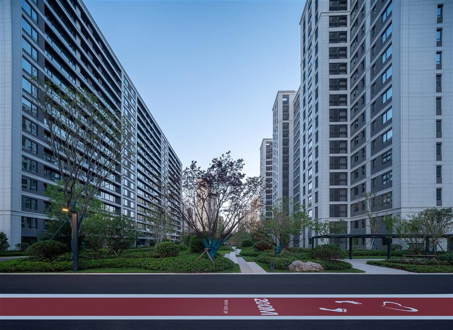 在中庭景觀的外緣設(shè)計(jì)了環(huán)形跑道,為散步者、慢跑者提供了親近自然的沉浸式的空間體驗(yàn),喧囂城市中生活的人們的內(nèi)心得以療愈、安寧。設(shè)計(jì)把公共空間的邊界延伸到住宅單元的門(mén)口,孩子們出了門(mén)便可以在房宅間的場(chǎng)域內(nèi)奔跑、玩耍。