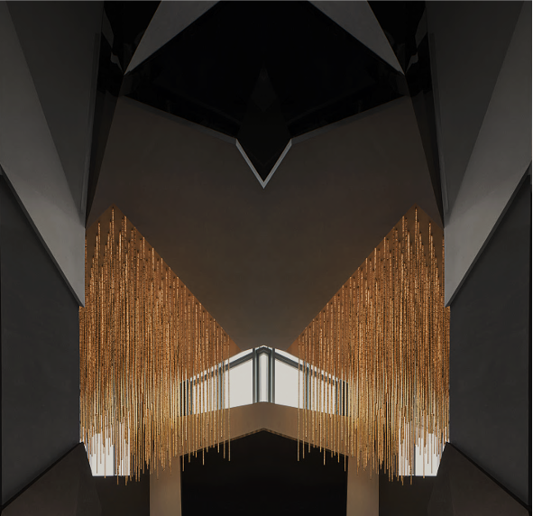 在鄰窗而立的洽談區(qū),不同寬幅的落地玻璃窗讓光的進(jìn)入有了新的路徑,商務(wù)洽談、休閑會(huì)友的功能性得以在規(guī)整有序的硬裝格局中展開(kāi)。金屬與鉆石切割的玻璃,鋪開(kāi)硬裝材質(zhì)的結(jié)構(gòu)化表達(dá)。而墨灰調(diào)墻體與地面的一致性,在金屬細(xì)節(jié)的點(diǎn)綴下連貫為空間的不規(guī)則造型,并銜接起內(nèi)外遞進(jìn)的層次感,將人引入歷史與未來(lái)的想象勝境。