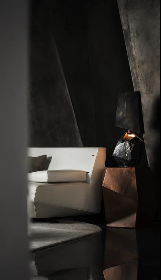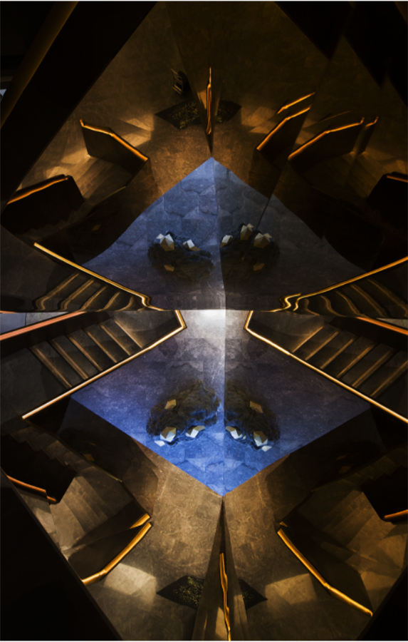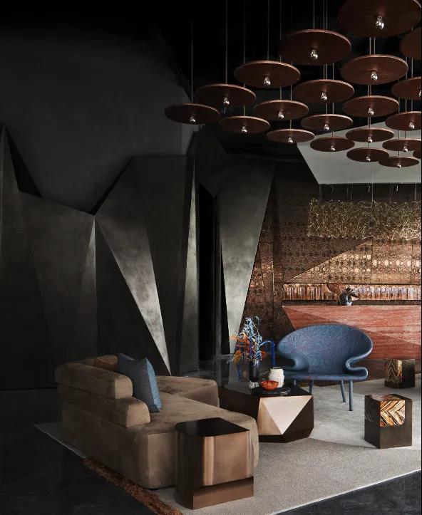 層層切割的金屬、石材與木材,構(gòu)成了硬裝的堅(jiān)實(shí)“骨骼”,從多面墻的銜接中圍合起空間的無(wú)限張力,散發(fā)出不被外界干擾的神秘張力。歷史的層層“鎧甲”變幻為硬裝設(shè)計(jì)的塊面化連接,呈以不同明暗度的色塊形態(tài),復(fù)古和創(chuàng)新碰撞出新的火花。