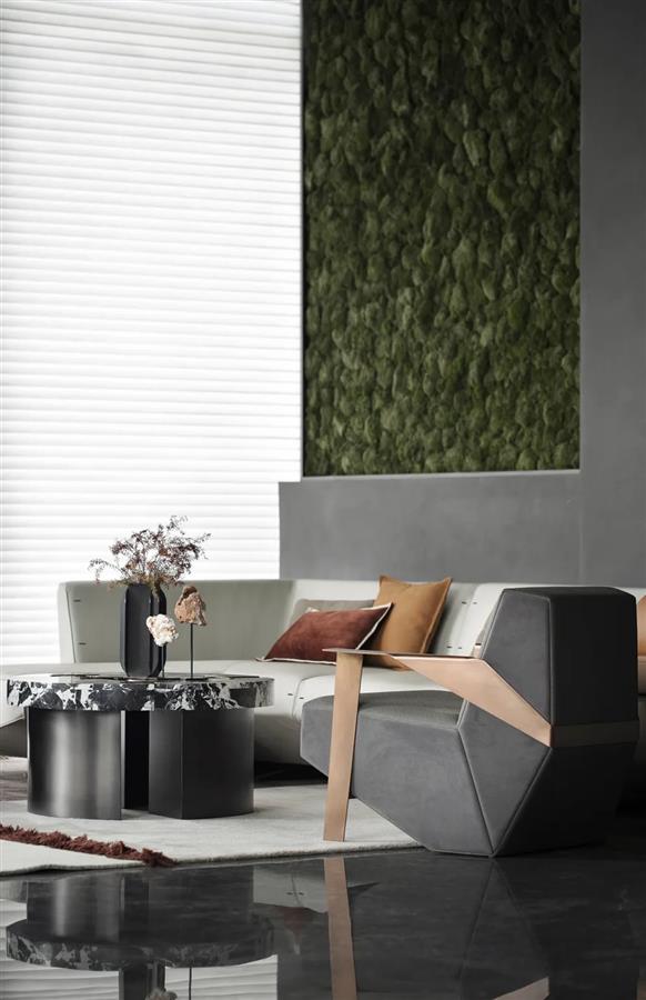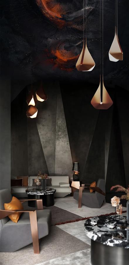 挑高格局之中,不規(guī)則天花體塊與墻體造型透過(guò)硬裝手法的豐富性,在材質(zhì)的和諧里打破穩(wěn)定的節(jié)奏。在硬裝上解構(gòu)體塊,在軟裝上融入柔性,布魯盟筆下的的空間呈現(xiàn)出星芒流轉(zhuǎn)、詩(shī)意如瀑的藝術(shù)畫面。自頂部向下延伸出不規(guī)則的立體塊面,呼應(yīng)著空中垂掛的金色銅制燈管,特立獨(dú)行的場(chǎng)域氣質(zhì)順沿動(dòng)線轉(zhuǎn)換而深入每一處。