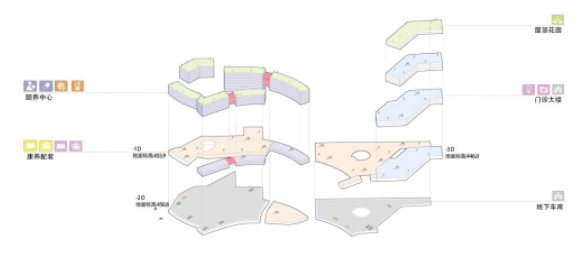 特殊的雙遺文脈奠定了設計的出發(fā)點。我們從人與自然的關(guān)系、以及山石之形抽象出建筑的形式語言,并融入功能,形成最終的建筑形態(tài)。綜合醫(yī)院棱角分明,如高聳的山峰;康養(yǎng)展廳如低伏的流水,呼之欲出;中部的康養(yǎng)中心則在剛?cè)嶂g進行承前啟后的完美過渡。不同形態(tài)的體塊堆疊,形成梯度變化的建筑輪廓線,與相鄰場地的建筑形態(tài)互補。
