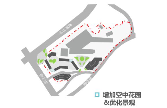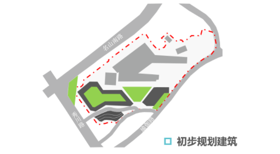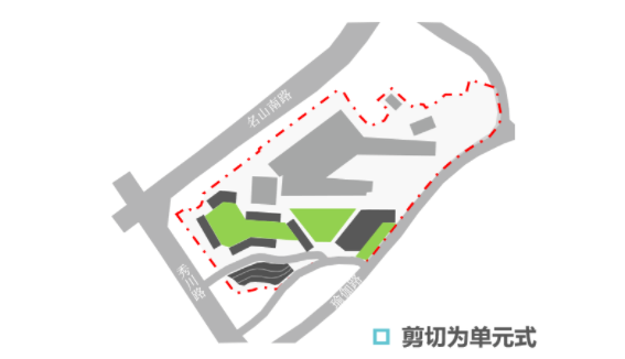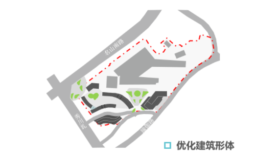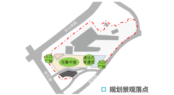 綜合醫(yī)院開口——場地分為三級臺地,瑜伽路展示面小、秀川路坡度陡且單向不適合開口,故將綜合醫(yī)院開口設置在名山南路;