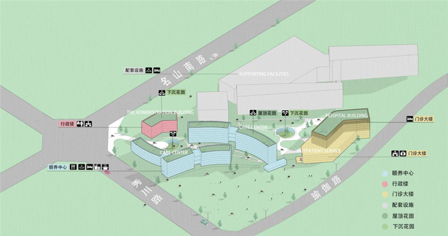 從功能分析,行政樓與綜合醫(yī)院聯(lián)系更為緊密,同時也可作為頤養(yǎng)中心與綜合醫(yī)院之間的空間隔斷,故將行政樓與頤養(yǎng)中心出入口設置在西北名山南路一側(cè),康復醫(yī)院出入口設置在東南瑜伽路一側(cè)。而為了景觀視覺效果,綜合醫(yī)院與行政樓均需要退讓出廣場空間。頤養(yǎng)中心由于場地使用者的需求,則設計成獨立的中庭空間。同時利用場地高差,將負一層設為半地下室,通過下層庭院、采光天井等,可使地下各功能房間均可擁有良好采光。
