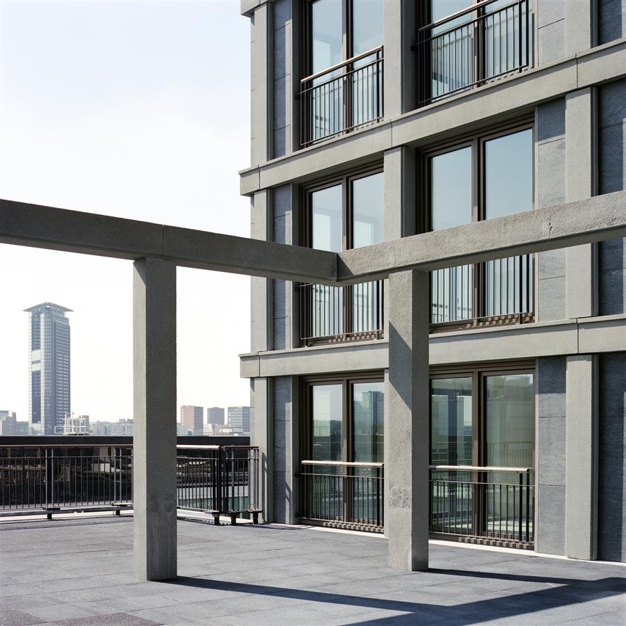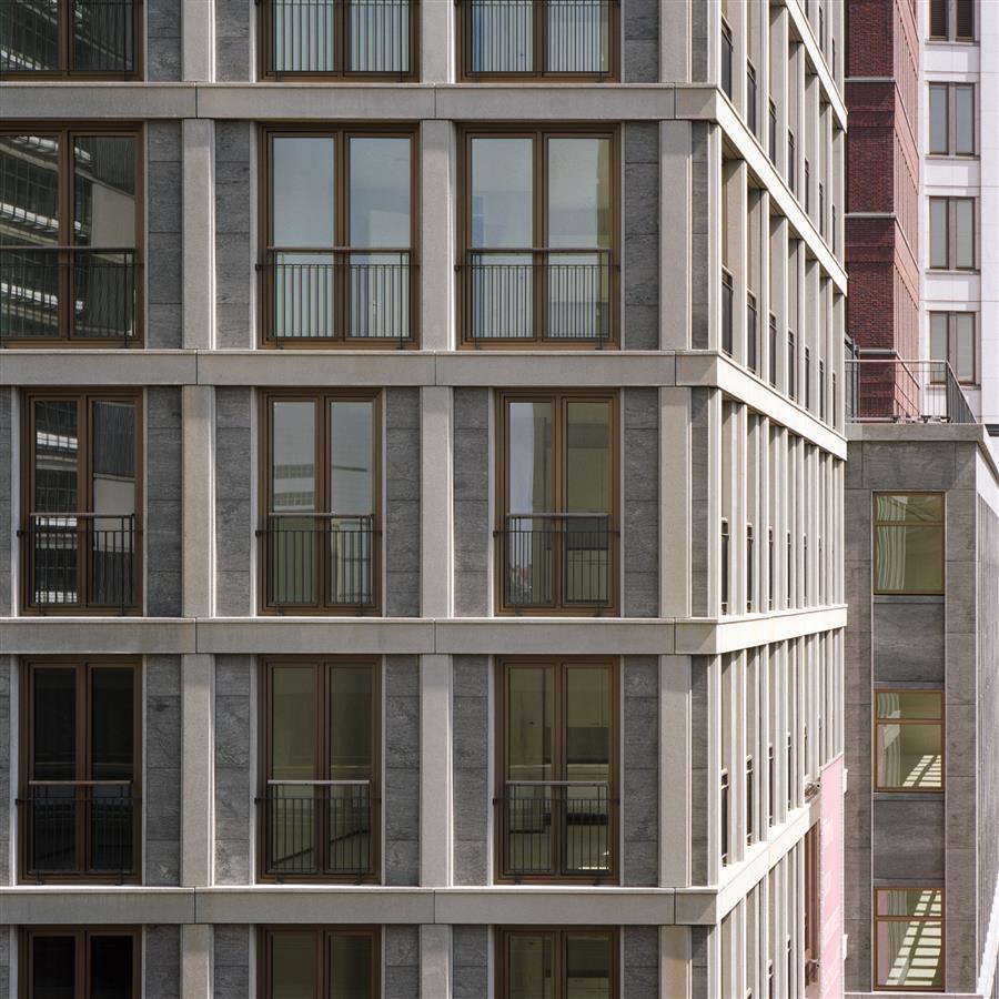 與公寓的高度相適應(yīng),采用了不同的窗戶類型。低層有薄薄的法式陽臺(tái),面向城市街道生活。在30米以上的高度,與街道的聯(lián)系消失了,公寓有較大的窗戶。在高層,盡管有強(qiáng)風(fēng)的影響,但凸窗使室外空間成為可能。由于外墻幾乎完全由玻璃制成,居民可以完美地享受風(fēng)景。不同的窗戶類型被整合到水平和垂直的混凝土結(jié)構(gòu)元素的礫石中。綠色火焰花崗巖的水平護(hù)欄和垂直側(cè)線以一種俏皮的方式使立面充滿活力。