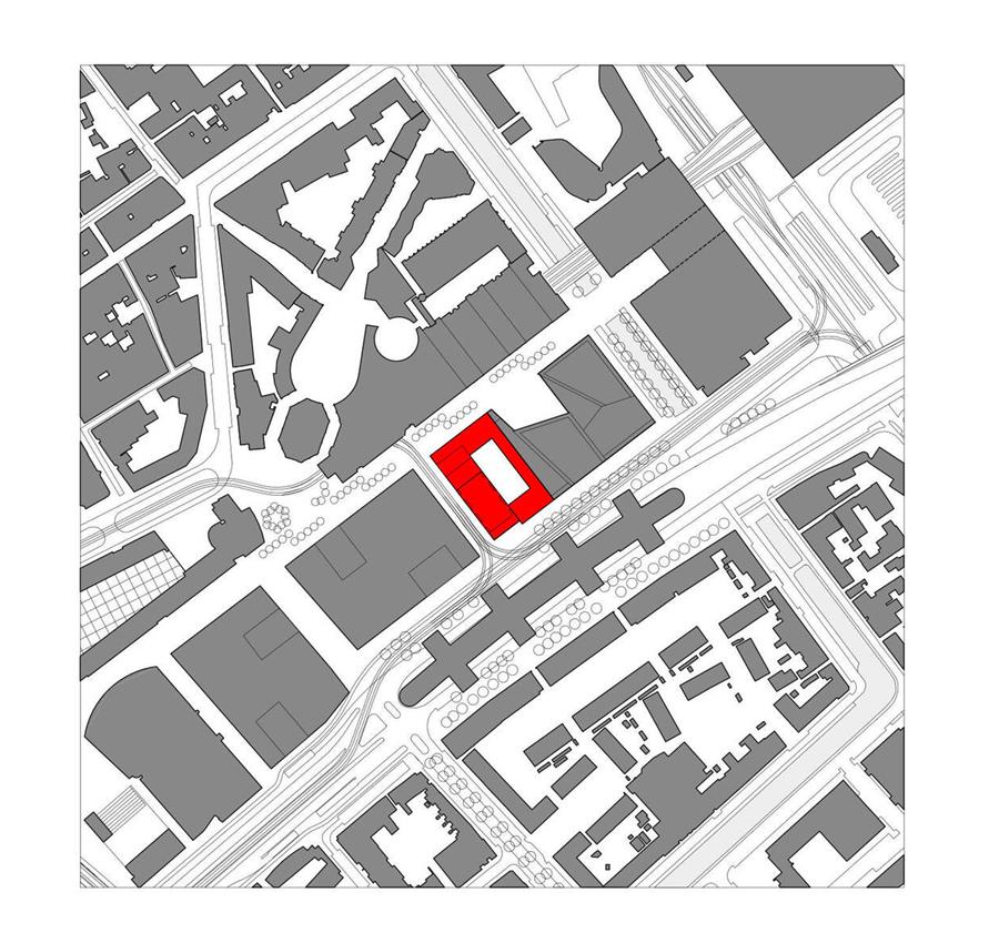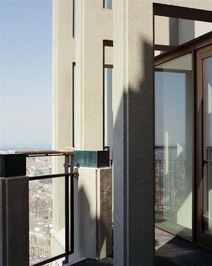 辦公樓和住宅樓在一個(gè)商業(yè)基座上彼此毗鄰。這座23米高的辦公大樓,圍繞著中庭大廳,從Turfmakrt一直延伸到Schedeldoekshaven。毗鄰它的住宅塔樓覆蓋了253套公寓:幾乎全部是角落公寓,可通過內(nèi)部走廊進(jìn)入。塔樓的后退與相鄰建筑的高度相適應(yīng),并保證街道上有足夠的日光。同樣,最終的挫折標(biāo)志著從社會(huì)住房向上層私人財(cái)產(chǎn)住房的轉(zhuǎn)變。