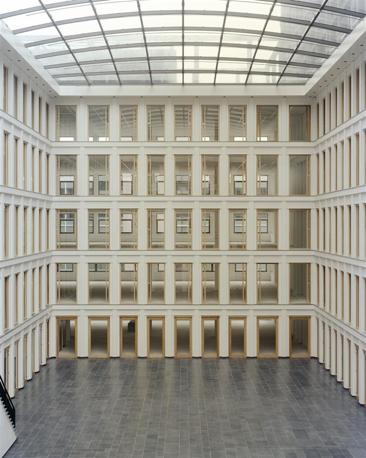 混凝土走廊墻和毗鄰的橫墻與苗條體量的穩(wěn)定支柱一起形成。因此,建筑的末端不受其穩(wěn)定效果的影響,增加了透明度,并提供了橫跨海牙屋頂?shù)娜啊T诮ㄔ爝^程中必須遵守的限制,導(dǎo)致了非常準(zhǔn)時(shí)的建筑物流和預(yù)制混凝土立面元素的選擇。典型的節(jié)理被元素的塑性和構(gòu)造接合所隱藏。Verde savannah是一種來自巴西的綠色花崗巖,使用噴砂混凝土元素的有色添加劑來增強(qiáng)其色調(diào)。