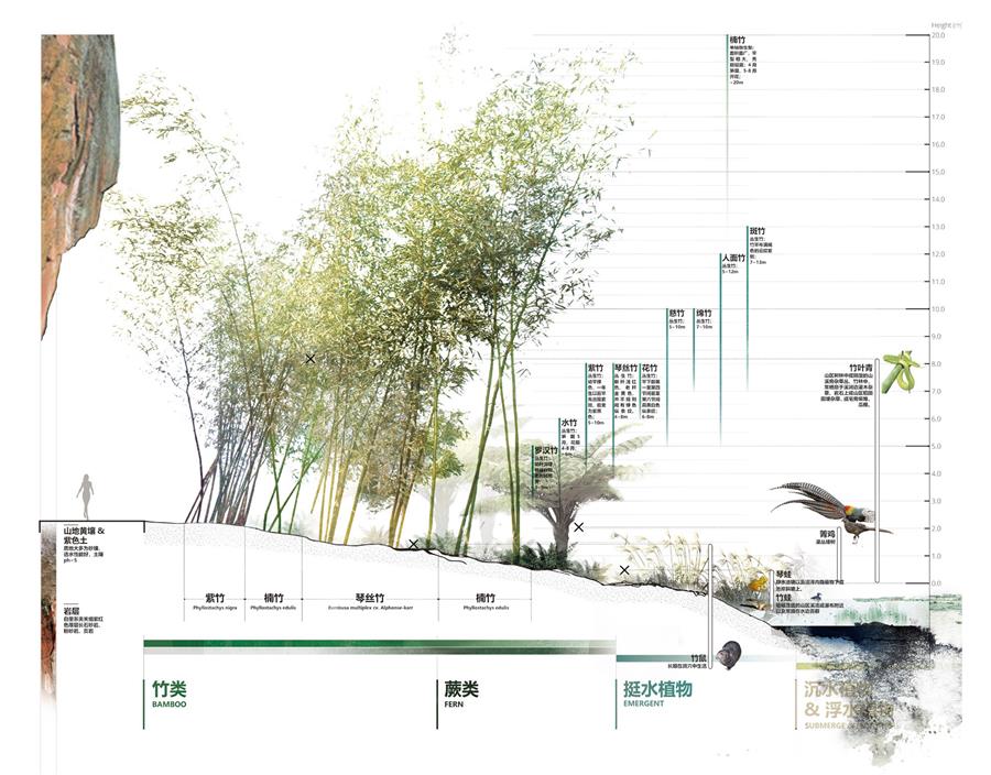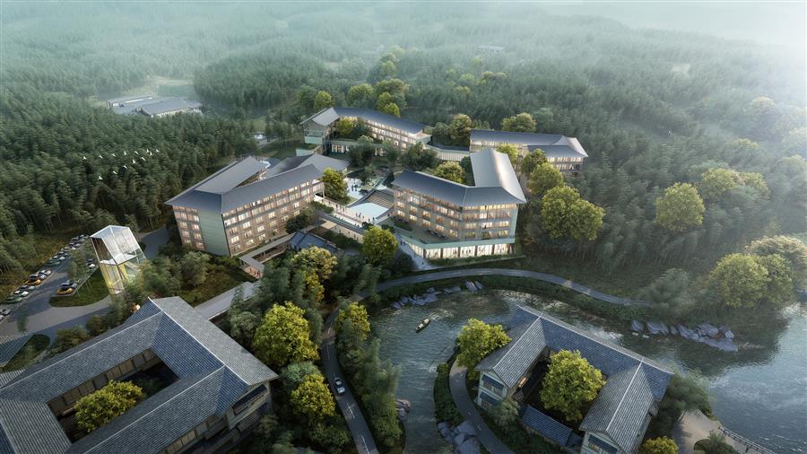 項目團隊提出以竹為核心的新東方自然主義的設計理念,充分研究當?shù)氐纳剿羌?、植被群落、民俗村落肌理等自然風貌,修復、提升環(huán)境品質(zhì),激發(fā)場所價值,展現(xiàn)竹林豐茂、柔美的自然特征。以輕介入的方式,將豐富的活動空間嵌入自然元素中,建筑群體分合有致,與自然和諧共生,打造竹水交融的大地景觀。