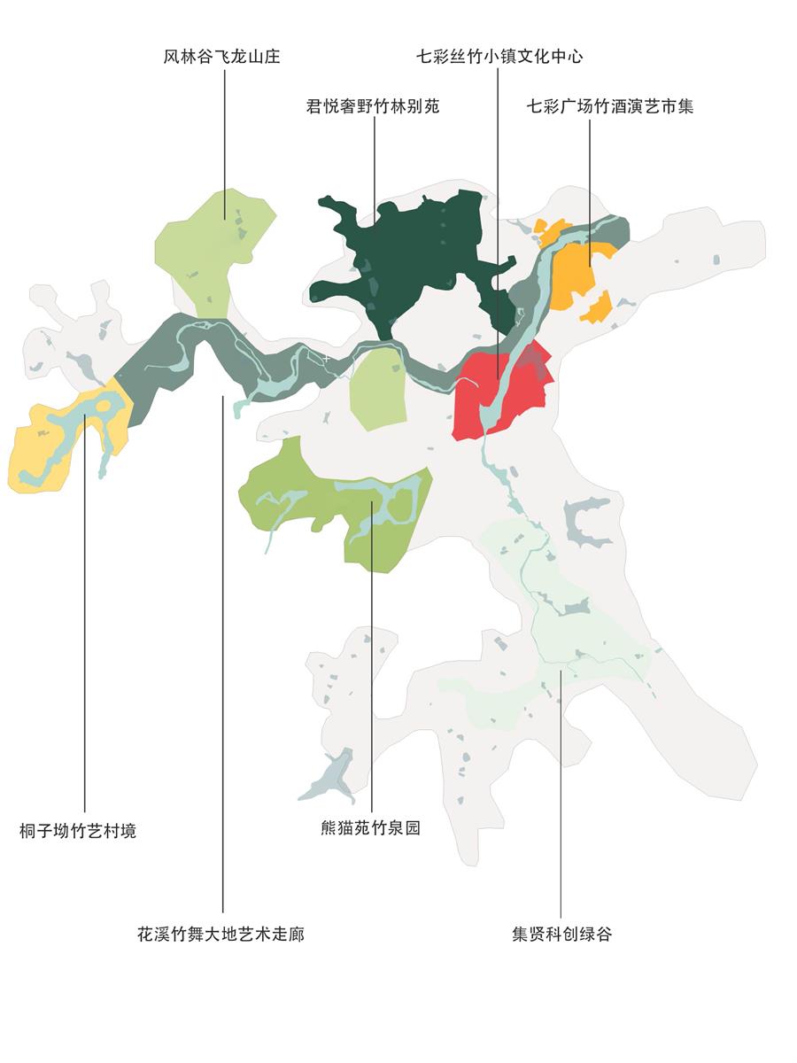 項目主要包括花溪竹舞大地藝術走廊、風林谷飛龍山莊、桐子坳竹藝村境、熊貓苑竹泉園、七彩絲竹小鎮(zhèn)文化中心、七彩廣場竹酒演藝市集、君悅奢野竹林別苑、集賢科創(chuàng)綠谷等八個部分。Cendes主要設計的是七彩廣場竹酒演藝市集、君悅奢野竹林別苑和集賢科創(chuàng)綠谷三個部分。