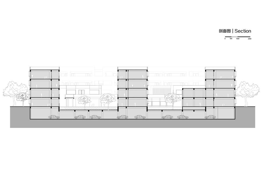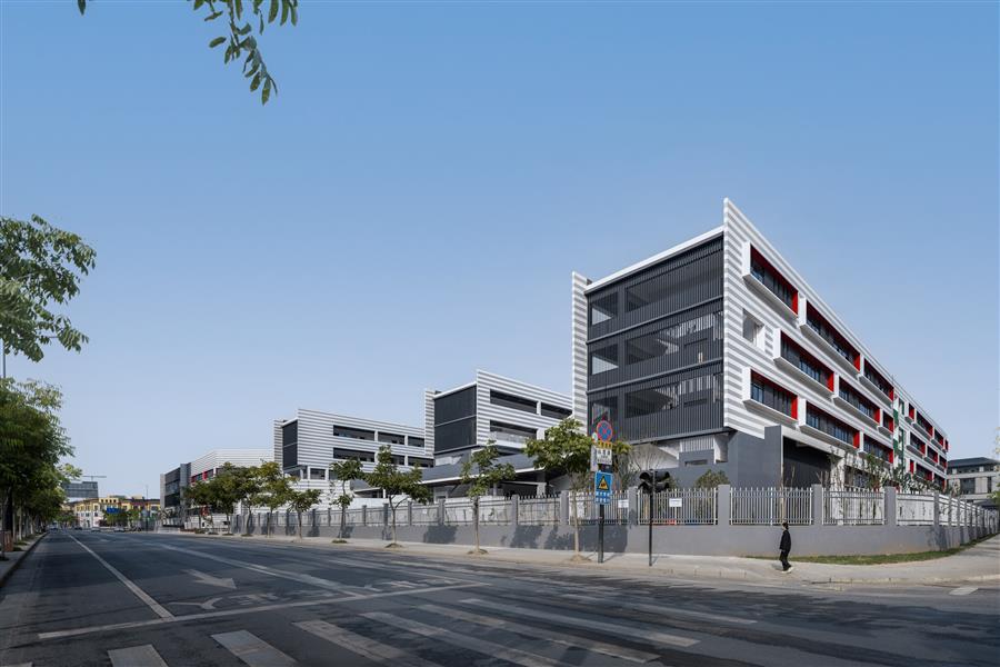 Going west along Yingjiashan Road, there is a modern-style "city" of about 100 meters long comes into view. On the white zebra-patterned facades, there are long horizontal red-framed windows and green traffic spaces. The interesting combination between simple gray-and-white stone paint and the red window frames makes the buildings" volume less overwhelming from street views.