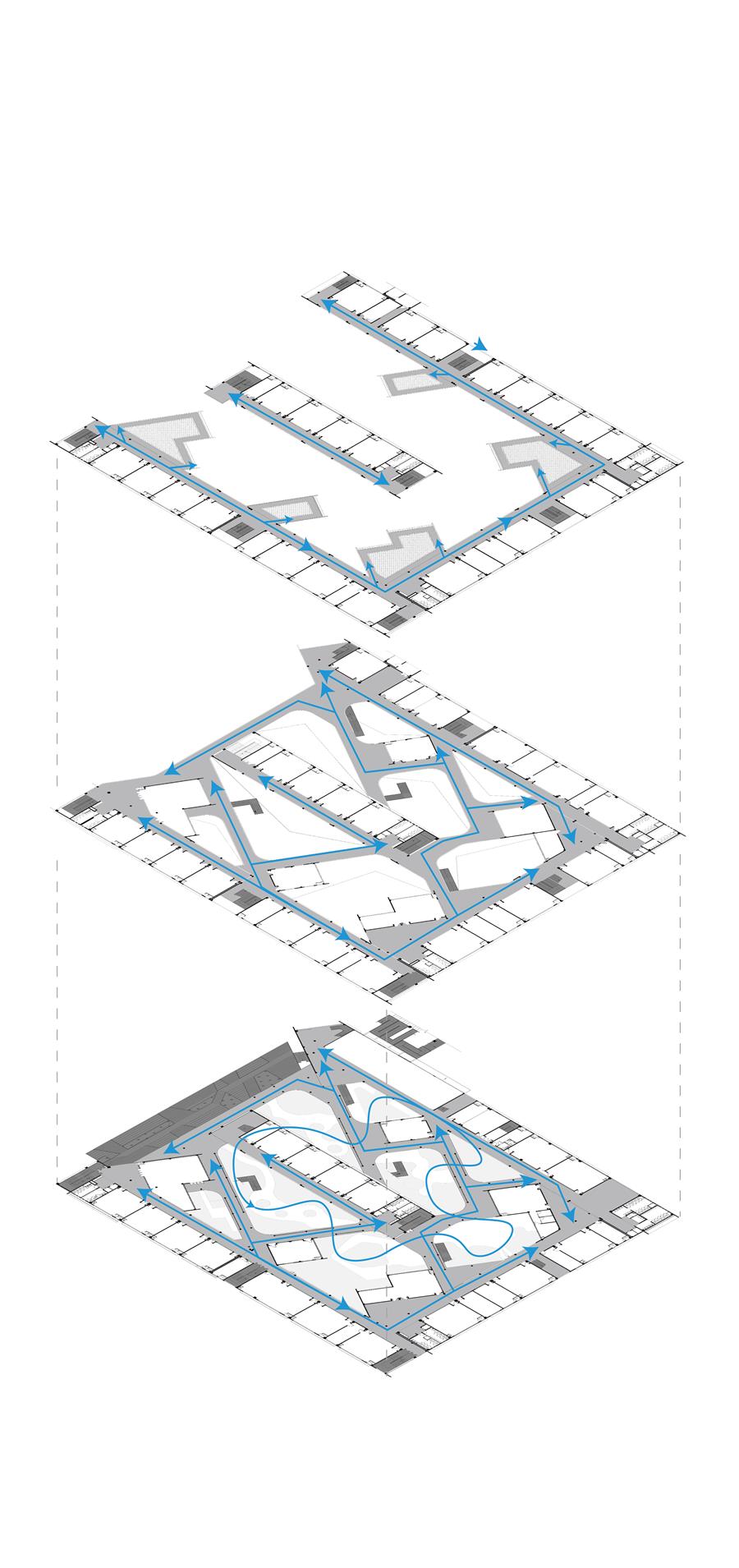 “小院”將流線網(wǎng)格旋轉(zhuǎn)30度,與“大城”的U形流線互聯(lián),在一二層的線性走廊內(nèi)編織出一座異質(zhì)動(dòng)態(tài)的庭院流線,將學(xué)生的流線從單線變?yōu)榫W(wǎng)絡(luò),尺度各異,交織連通,使得整體體驗(yàn)極具變化性,走廊既是是交通空間也是公共空間,大大提高了區(qū)域交通趣味性。