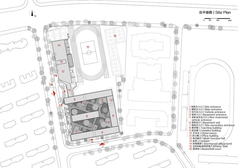 Inside the campus, taking the main entrance as the axis, the north is the "moving area". The playground and several sports venues keep the noises from Yingchuan East Road away, together with the administrative management, to create a sports park that can be shared with the community for different timeslots; the south part is the "quiet zone", the teaching area, the "big city".