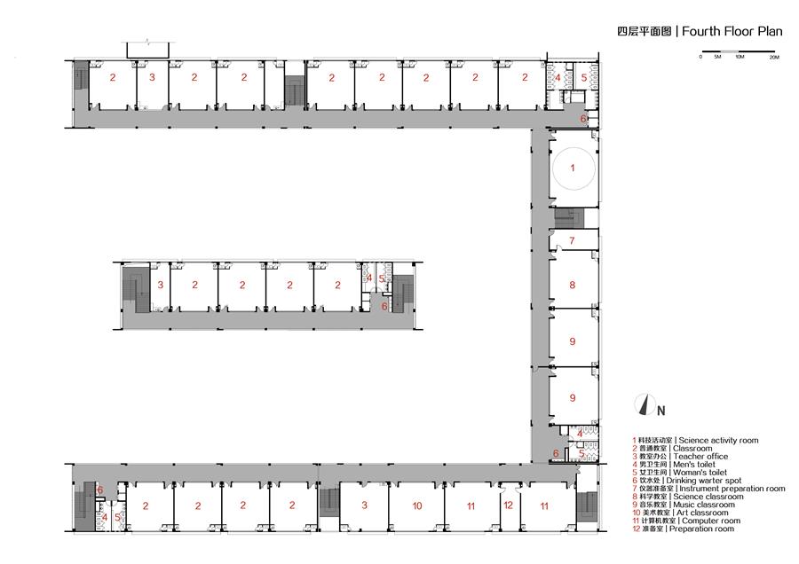 The "big city" is about 300 meters long and is enclosed in a U shape. The general classrooms are distributed in the south part of the main building; classrooms for music lessons and labor skill are distributed in the east side of the building. The horizontal corridors connect both parts, allowing intercommunications between different programmes.