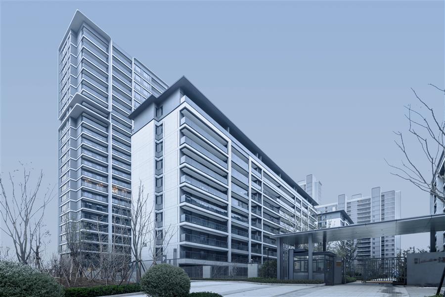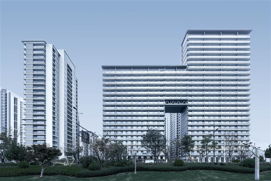 立面設(shè)計(jì)延續(xù)一期的住宅立面風(fēng)格,利用弧型折板、“C”型飄板造型、大玻璃面等元素,在城市空間形象上形成呼應(yīng)。此外,地塊東北角地標(biāo)性住宅樓以錯(cuò)落的形態(tài)和流暢的水平線條打造視覺沖擊力震撼、立面效果純粹輕盈的形象。