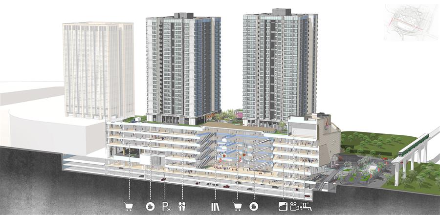 E館規(guī)劃設(shè)計(jì)為一棟購(gòu)物中心及兩棟百米住宅,遵循時(shí)代天街整體規(guī)劃,將住宅沿場(chǎng)地外側(cè)設(shè)置,圍合成“盆地”形狀的空間布局,中心部分的屋頂、戶外場(chǎng)地形成統(tǒng)一聯(lián)系,提供更多優(yōu)質(zhì)的公共活動(dòng)空間。東側(cè)承接道路地鐵引來(lái)的城市人群;西、南側(cè)分別銜接項(xiàng)目C、D館,使大坪正街與長(zhǎng)江二路實(shí)現(xiàn)無(wú)縫連接。
