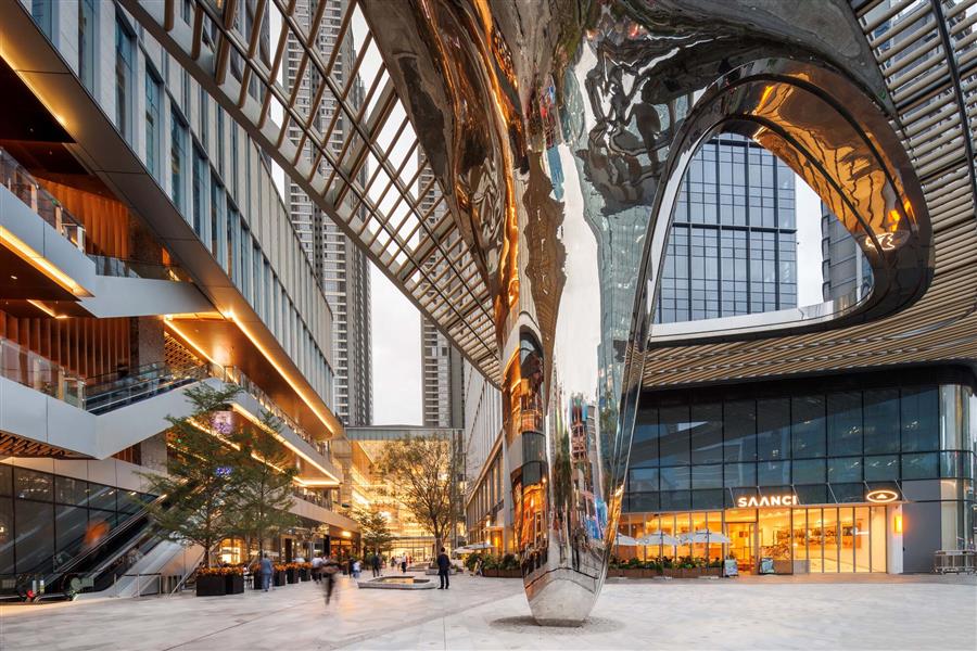 MixC Sungang引人注目的正面是一個(gè)雕塑般的不銹鋼頂棚,將游客拉入步行商業(yè)街,為購(gòu)物者和食客創(chuàng)造一個(gè)充滿活力的林蔭道。