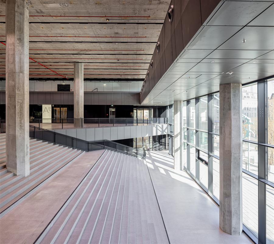 Study and analysis of the existing building — The new design was preceded by an extensive reading and understanding of the existing building from the 1970s. Using historical plans and documents, DMAA and JWA analyzed and internalized the initial ideas of the 900 architect, Karl Schwanzer to make a fundamental decision between demolition and conversion. With the help of BIM (Building Information Modeling), a digital twin of the existing building was created, which enabled comprehensive studies of the concrete cubature and the consequences of possible adaptations. The potential of the existing building with its economically optimized reinforced concrete structure, which was exceptional for the 1970s, was thoroughly examined in terms of statics, noise, and fire protection, as well as suitability in terms of building physics. Characteristics of the existing building in its function as the headquarters of Bank Austria were the mirrored facade and a striking, expansive, but almost unused staircase. The mirrored facade emphasized the hermetic nature of the building, while the monumental gesture of the external staircase dominated the area of Julius-Tandler-Platz. The remodeling allowed these outdated stylistic elements to be removed.