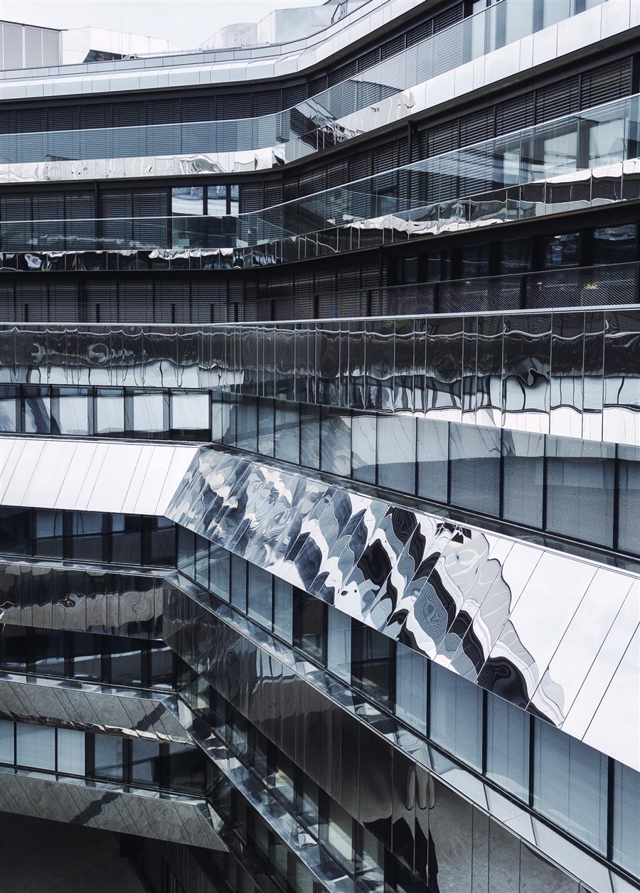 The facade of the building was freed from its mirroring. The new stainless steel cladding of the fa?ade has a glare-free and silky matt appearance thanks to its fine embossing, while the terraces create additional open spaces for restaurants and offices and a counter-design to the building's previous seclusion. Another planning focus was on the design of a vivid base zone. The extensive opening of the base achieves the desired spatial relationship to Julius-Tandler-Platz, makes the station hall more attractive, and creates an inviting connection to the central plaza level. At the northern rear of the building, a connecting structure from the 1970s, between the office complex and the garage, was removed in order to return to Karl Schwanzer's 900 idea of a cubic solitary building.