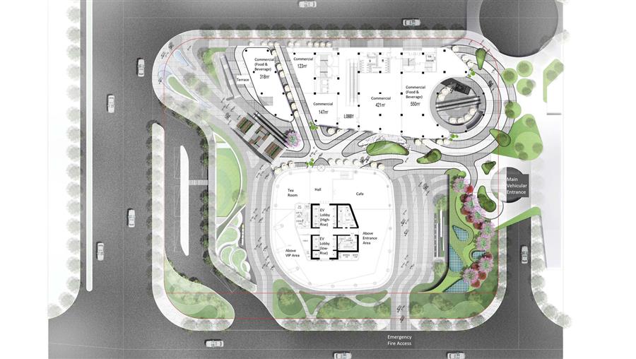 Positive Design Chai – The soft forms and rich public spaces of this project provide visitors with a place to relax, allowing them to move around comfortably without getting lost, altering their actual city experience, and promoting regional revitalization and interaction. This high-rise building serves as the headquarters of a leading company, but it also has an altruistic "attitude" toward the city in its role as a hub. By awakening the positive behavior inherent in architecture, it transcends conflicts of interest with neighboring properties, positioning itself as a partner in revitalizing the city. It is expected to positive influence on surrounding buildings. Such altruistic architectural gestures transcend individual buildings. In this project, they embody the symbolic stance of the entire Media Port complex in fostering public spaces and cultural exchange, with a new vision for urban living.