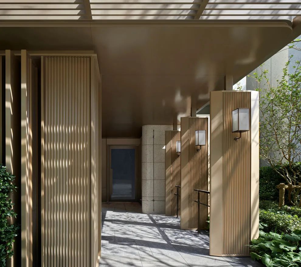 而在整體建筑立面的打造中,設(shè)計也始終于尺度、比例、材質(zhì)和光影之間,保持一種內(nèi)斂而有力的節(jié)奏感。疊拼樓棟立面結(jié)合金屬線條及重點圓弧細(xì)節(jié),使立面更顯精致與典雅。漂浮飛檐、木石隔柵和風(fēng)情序廳等元素,則通過現(xiàn)代簡約的設(shè)計語言,巧妙打破古典主義的嚴(yán)謹(jǐn)對稱,塑造出輕盈而豐富的空間層次。